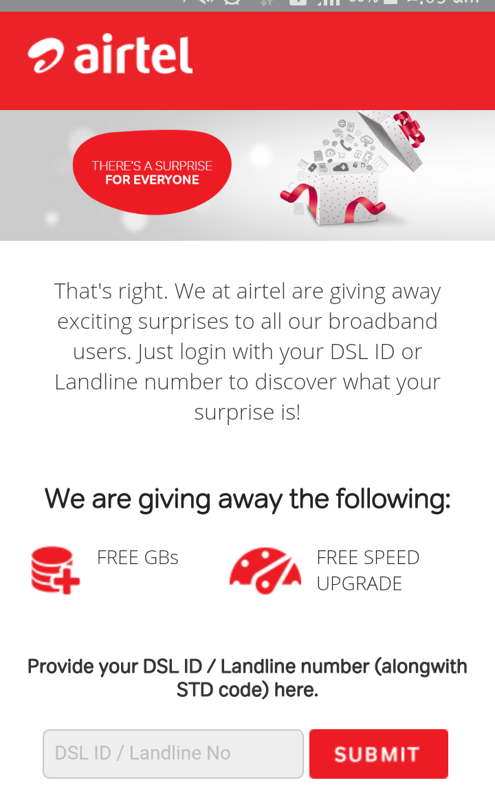 Well ,now arises the question, how can you grab these surprises ?So guys ,it’s as simple as it can be ! You just have to visit the site , http://broadbandsurprises.airtel.in/ and login through your DSL ID or landline number and you will automatically get the amazing offer that’s especially put for your account .You just need to share this awesome good news with your friends and pals on social sites of Facebook and Twitter and Whoaaaa ! You get the surprise of the year in your kitty .