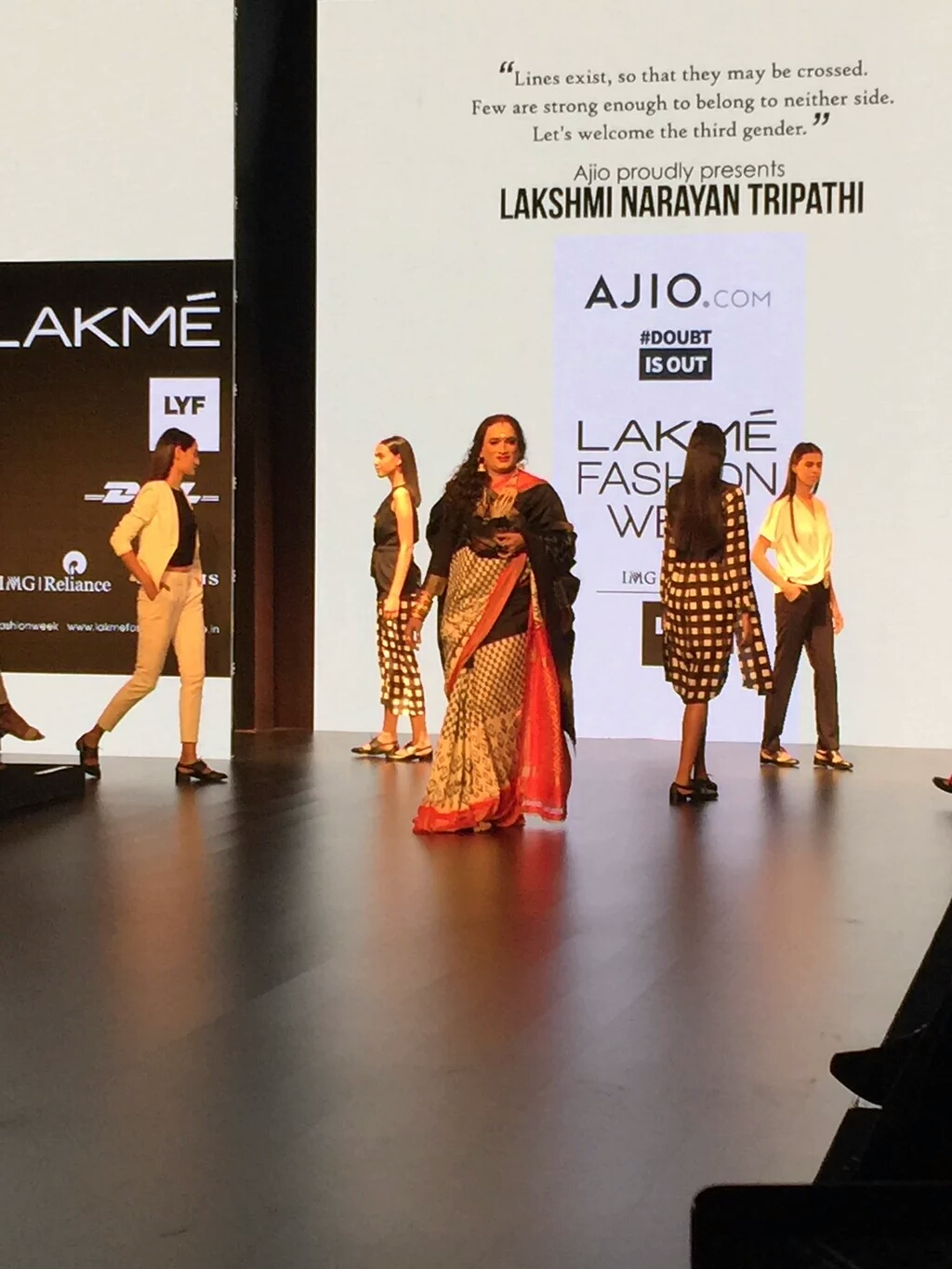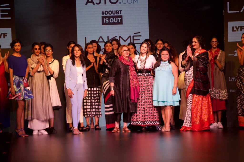 The first type of being gender no bar was eminently devoted to pantsuits, checked caperies, black tunic, leather biker jacket with ikat saree ,tie up blouse, white skirt- blouse combo paired with black or white jacket. This sublime collection was show stopped by Laxmi Narayan Tripathi, an activist and representative of LGBT wearing black, white and red Ikat saree.