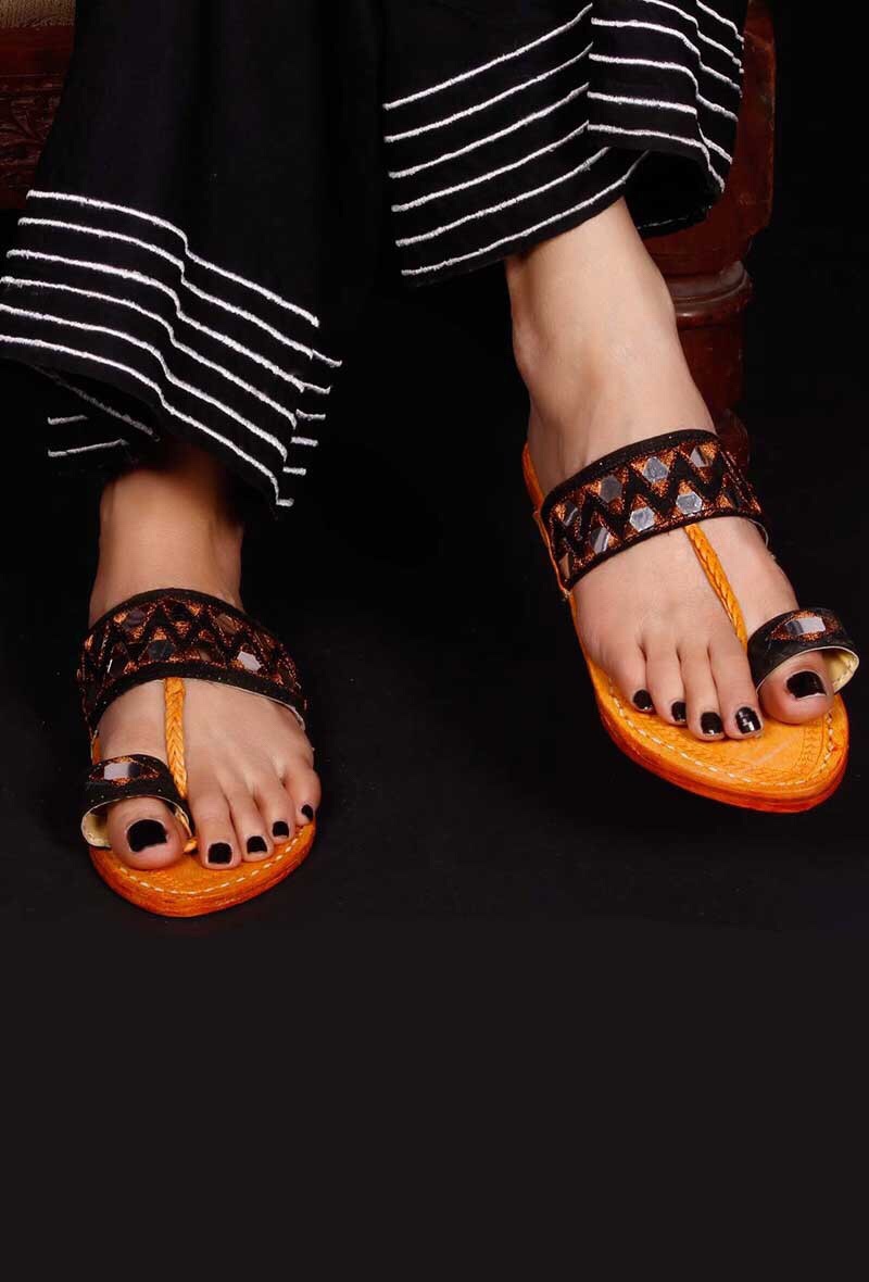 Pamir Rabari Kolhapuri chappal with Mirror Embroidery, tribal pattern embellished and bronze zari. Rabari the art on the chappal is inspired from the tribe in Gujarat. This chappal is suitable for traditional as well as casual outings. You can combine these with a lovely set of kurti and palazzo or jeans and top.